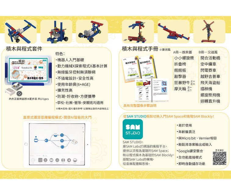 樂高積木與SAM Labs無線藍芽馬達的最佳組合套件,適合機器人入門基礎,無線藍牙控制無須聯網,搭配直覺式的運算思維編程,開啟孩童AI智能的大門!